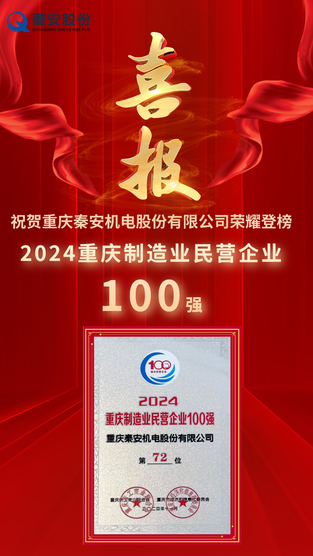 喜報(bào)|重慶秦安機(jī)電股份有限公司榮登2024重慶制造業(yè)民營(yíng)企業(yè)100強(qiáng)
